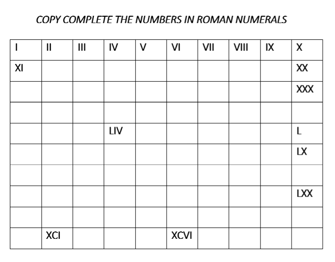 - count and write Roman numerals from 1 to 100, i.e. from I to X.
